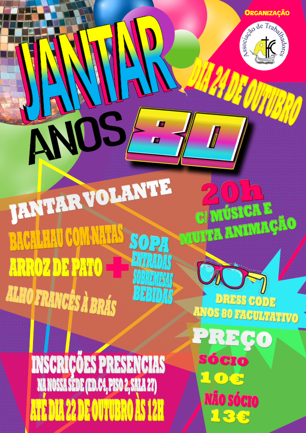 O Jantar “Anos 80” irá ter lugar no próximo dia 24 de outubro de 2025 às 20:00 no edifício C7.